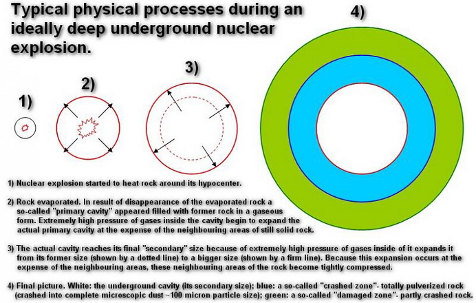 U početnoj fazi svake nuklearne eksplozije oslobađa se ogromna energija u vidu takozvane “primarne radijacije” i to je njen glavni energetski deo (oko 99 posto energje) koji se oslobađa u vidu X -zračenja koje se u slučaju atmosferske eksplozije vidi kao jak bljesak. Pošto se skoro 99 posto eksplozivne energije potroši na zagrevanje okolnog vazduha desetine metara unaokolo od centra eksplozije (takozvane nulte tačke) ona se još naziva i termonuklearnom eksplozijom. To zagrevanje se događa jer X-zraci ne mogu da putuju previše daleko, pošto ih konzumira okolni vazduh. Zagrevanje ovog malog vazdušnog prostora rezultira pojavom takozvane nuklearne lopte (na vrhu pečurke) što nije ništa drugo do ekstermno zagrejan vazduh. Ove nuklearne vatrene lopte su odgovorne za dva glavna destruktivna faktora u atmosferskoj nuklearnoj eksploziji – njenoj termalnoj radijaciji i njenom udarnom vazdušnom talasu. Oba nastaju isključivo usled visoke temperature vazduha. NADZEMNA I PODZEMNA NUKLEARNA EKSPLOZIJA SE VEOMA RAZLIKUJU Međutim, kada se odigrava podzemna nukleana eksplozija sve je drugačije. Ne postoji vazduh oko malog podzemnog prostora duboko pod zemljom u koje je stavljeno nuklearno punjenje, tako da se čitava energija koja se odmah oslobađa u formi X zraka utroši na zagrevanje okolnog kamena. Rezultat ovog termalnog efekta je topljenje kamena (slično kao kod vulkana) i isparavanje nastalih gasova. S obzirom se se sve događa duboko pod zemljom istopljeni kamen će pod pritiskom gasa stvoriti podzemnu šupljinu. Njena veličina zavisi od snage nuklearnog punjenja. Dakle, koliko će se kamena istopiti i kolika će se šupljian stvoriti, zavisi od jačine nuklearnog punjenja i postoje veoma precizno uradjene tablice koje to pokazuju. Naravno, zavisi i od vrste kamena.