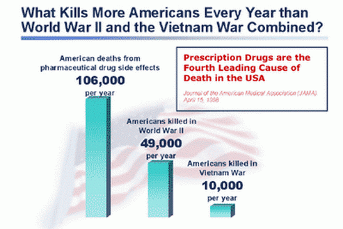 Efekat je da godišnje samo u SAD od trovanja lekovima umre preko 100 000 ljudi, što je više nego broj svih poginulih američkih vojnika za godinu dana u Drugom svetskom ratu i Vijetnamskom ratu.