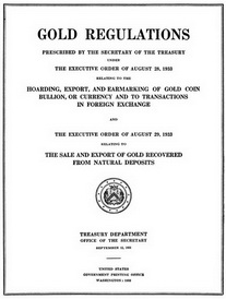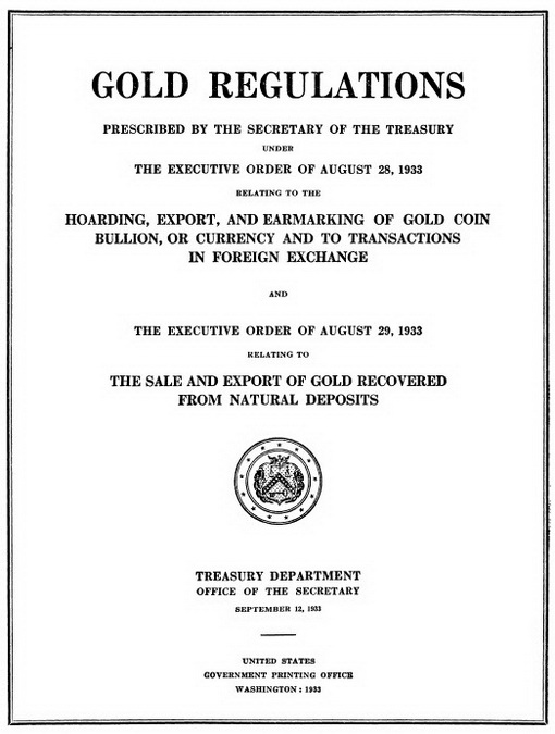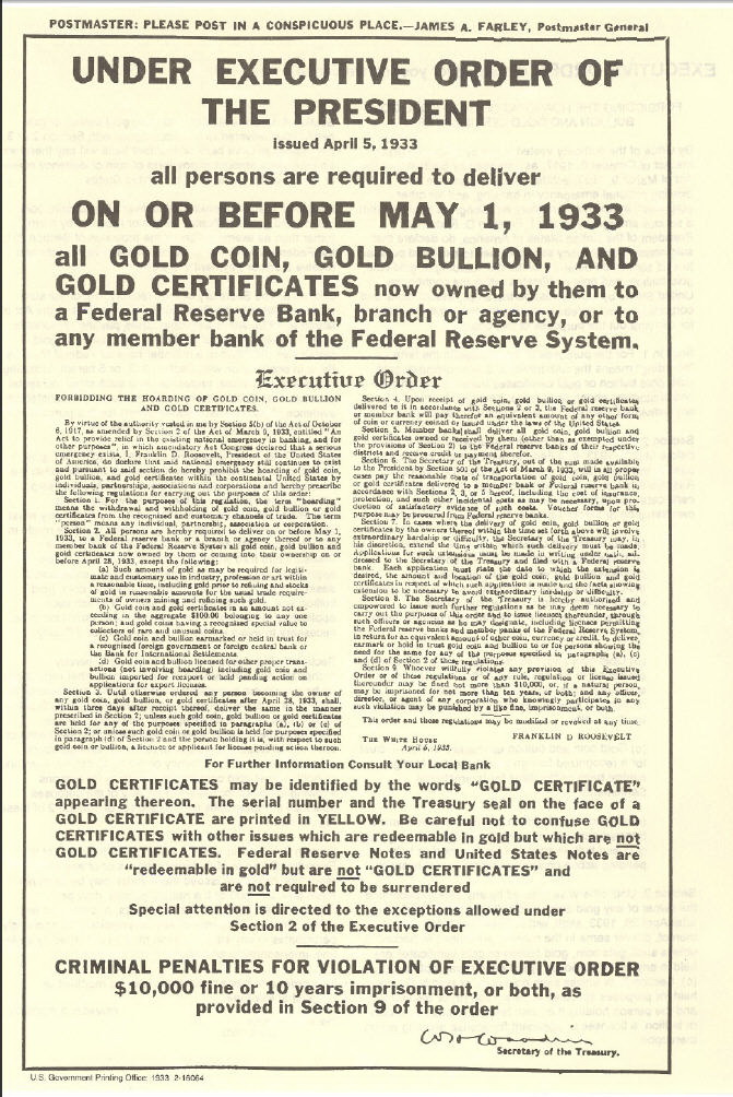 Sve do 1933. godine ugovor FED-a i njenih deponenata zlata bio je poštovan. Novac koji su izdavali mogao se zameniti za zlato. Ali, nakon 1933. to se menja. Za vreme depresije kada su se ljudi našli u poziciji da preživljavaju, bankari su počeli da se plaše da će deponenti doći po svoje zlato, a njega više nije bilo u količini koliko je dolara emitovano. Tako su došli na ideju da proguraju državne propise kojima će od američkih građana jednostavno konfiskovati zlato. Podizanje zlata iz banaka trebalo je proglasiti kao “nacionalnu opasnost”.