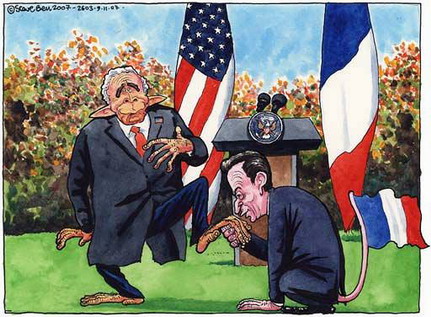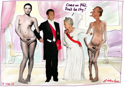 Kada je britanska kraljica Elizabeta II udostojila "prvu damu" Francuske prijemom najvišeg ranga, Englezi su to prokomentarisali ovom karikaturom: "Hajde, Filipe, nemoj da se stidiš!"