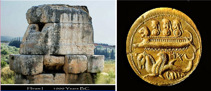 Navodni Hiramov grob i feničanska zlatna kovanica koja pokazuje Feničane kao lađare. Na pramcu lađe je lavlja glava.