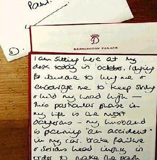 Odmah su krenule glasine da je udes aranžirala britanska tajna služba MI6 na zahtev Bakingemske palate, koja navodno nije mogla da podnese da prinčevi Vilijam i Hari imaju polubrata (polusestra se nije pominjala) koji bi bio Arapin po ocu, ukoliko bi se Dajana udala za Al Fajeda. Oni su, navodno, to planirali i već čekali dete. VAŽNO JE KOMPROMITOVATI PRINCA ČARLSA Nakon sedam godina, januara 2004. Dejli Miror je objavio ekskluzivno i jedno pismo, koje je Princeza Dajana dala svom batleru, Polu Barelu, sa tim da ga on čuva kao dokaz za ubuduće , ukoliko joj se nešto desi. U pismu Dajana otkriva da će joj se dogoditi neka nesreća i da joj o glavi radi niko drugi do "njen muž", jer planira da joj smesti saobraćajku u automobilu sa neispravnim kočnicama. Zanimljivo je da Dajana ispisuje svoja strahovanja oslovljavajući princa Čarlsa veoma naglašeno sa "moj muž" iako je mnogo logičnije da kaže Čarls ili Princ Čarls, ako se pismom obraća baš batleru .